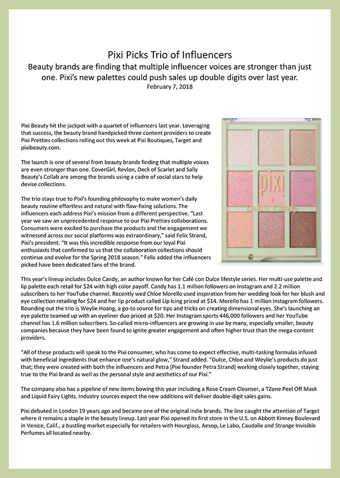 "Pixi Beauty hit the jackpot with a quartet of influencers last year. Leveraging that success, the beauty brand handpicked three content providers to create Pixi Pretties collections rolling out this week at Pixi Boutiques, Target and pixibeauty.com." Read more at WWD.com